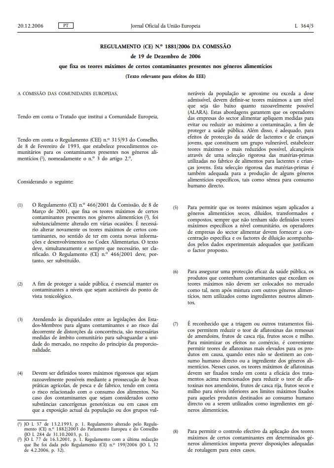 Limites máximos de contaminantes em alimentos, incluindo metais pesados no cacau.
