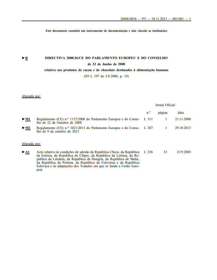 Definição e normas do chocolate destinado ao consumo humano: - Define os tipos de chocolate (negro, leite, branco). - Percentagens mínimas de cacau, manteiga de cacau e sólidos de leite. - Impede a adição de gorduras vegetais diferentes da manteiga de cacau, exceto quando expressamente permitido.